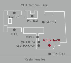 The map shows the restaurant and the campus surrounding it - you can rent all facilities on campus! Just click the place on campus that you would like to see!